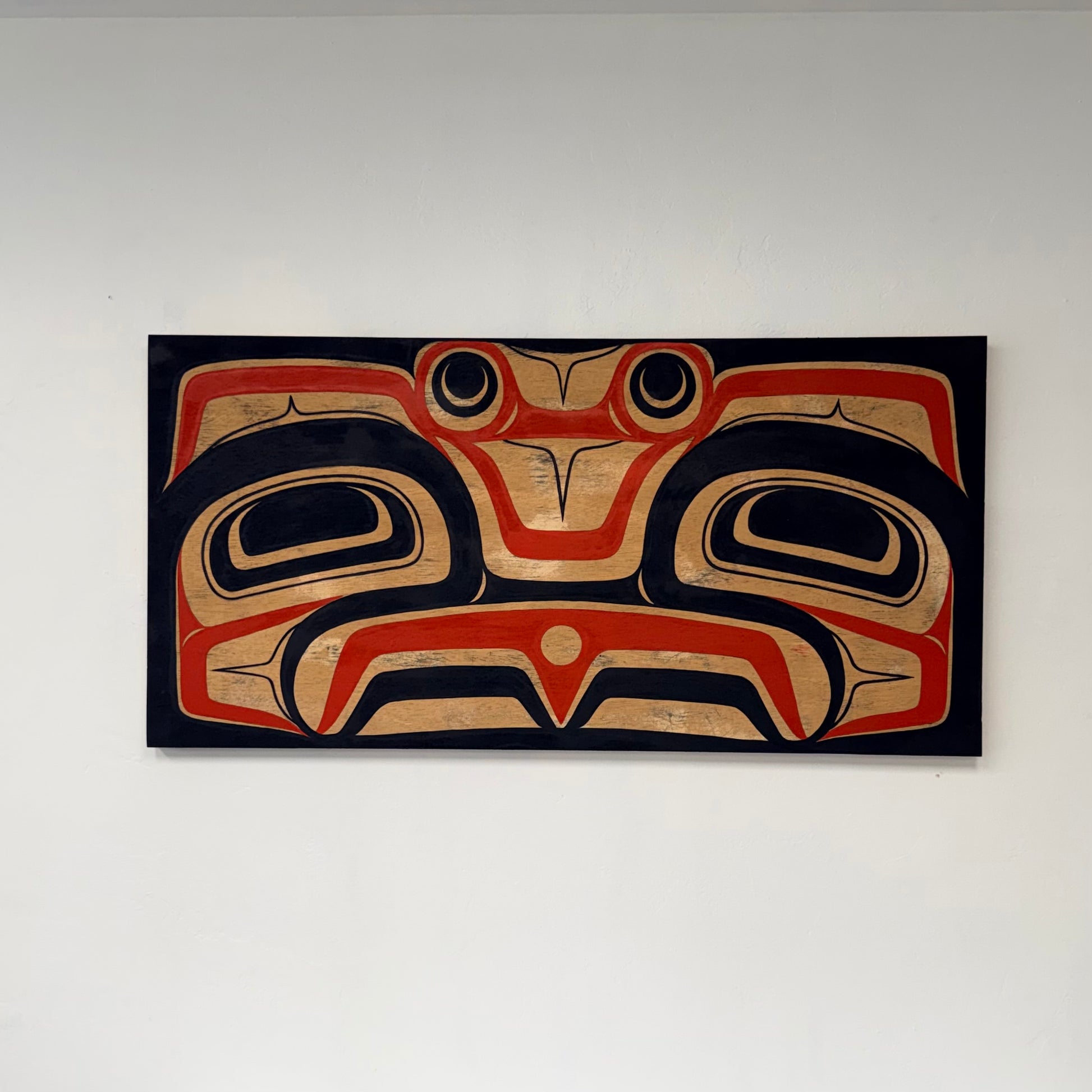For this series of paintings started experimenting with wood backgrounds and creating different textures on the wood canvas. I focused on the symmetry of the design and keeping the formline as traditional as possible.
